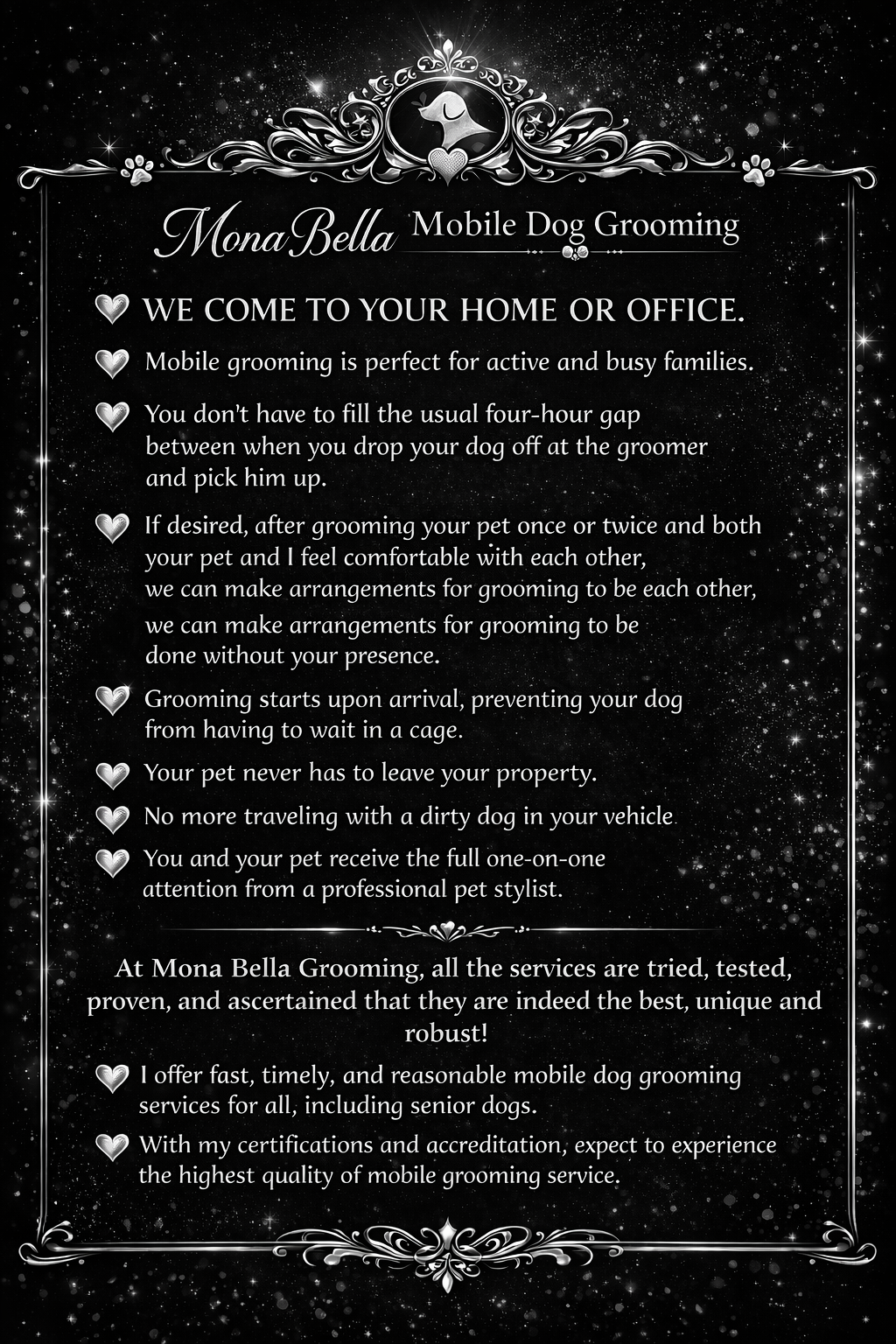 So happy to have finally found a groomer that my fur baby � is completely in love with!!! Over the years I’ve tried so many places, but Nyko always had really bad anxiety! When Erika arrives for his monthly spa day, he is so happy to see her!!! Thank you so much for making him feel so comfortable.... and of course the spa treatment.... He looks amazing, smells great & his shedding is finally under control!!! I have & will continue to recommend Mona Bella!!!