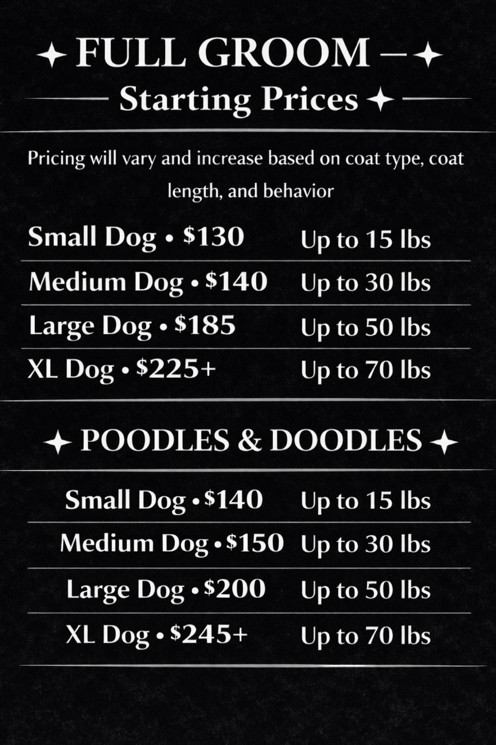 Pricing will vary and increase based on coat type, coat length, and behavior